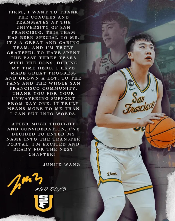 配文:首先我想感谢旧金山大学的教练和队友们。这支球队对我来说很特殊,这是个充满关心的团队。我非常感激过去三年能够与团队共度时光。在这些日子中我取得了很大进步,也成长了很多。对于球迷和社区,感谢你们对我的支持。经考虑,我决定将我的名字放入转校系统中,我对即将到来的故事感到兴奋并做好准备。